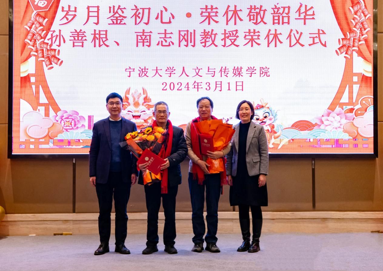 新学期伊始,海角视频 举行“岁月鉴初心、荣休敬韶华”孙善根、南志刚教授的荣休仪式。仪式上李乐院长为两位教授颁发荣休证书,张佩芬书记为两位教授献上鲜花和礼物。两位退休教师分别发表了退休感言。退休,虽然代表着一段职业生涯的结束,但更象征着一个新生活的开始。他们用他们的专业能力和学术智慧,书写了属于自己也属于学院一段精彩的篇章。