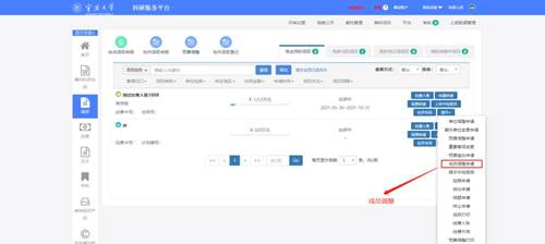4. 进入项目组成员,请确认成员是否完整。特别是项目中有学生的参与的,请完善学生身份类别。成员信息有问题的,进入科研系统海角视频,左侧的项目界面,点击操作下拉框下的成员调整申请,进入成员调整界面进行添加和修改,待项目主管审核之后,会自动补充到项目经费公开一览表,最后再提交即可。