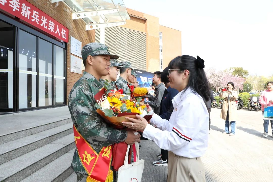 欢送会伊始,学生发展与服务处处长、校人民武装部部长胡铭老师宣读了2022年春季应征入伍名单。校党委副书记童晓晖、校人民武装部负责人为应征入伍学生佩戴红花,赠送纪念品,为即将开启军旅生涯的同学们送上衷心的祝福。