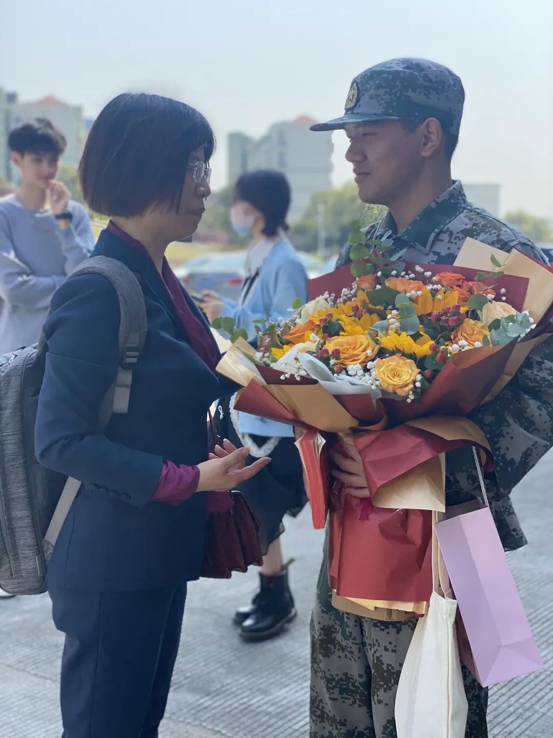 学校仪式结束后,班主任庞菊爱老师和班级同学代表一起欢送李承骏同学。李承骏同学直率又真诚地表示,自己向往军队,渴望在训练场上打靶操练,希望通过刻苦训练实现人生的梦想,披荆斩棘、破浪而行。