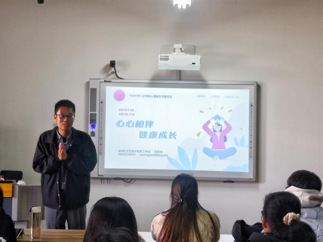 心理系兼职硕士生导师陆宗尧为学院全体心理委员做“心心相伴 健康成长”的主题讲座。学院党委副书记孙文静、学工办主任李洪伟一同出席。