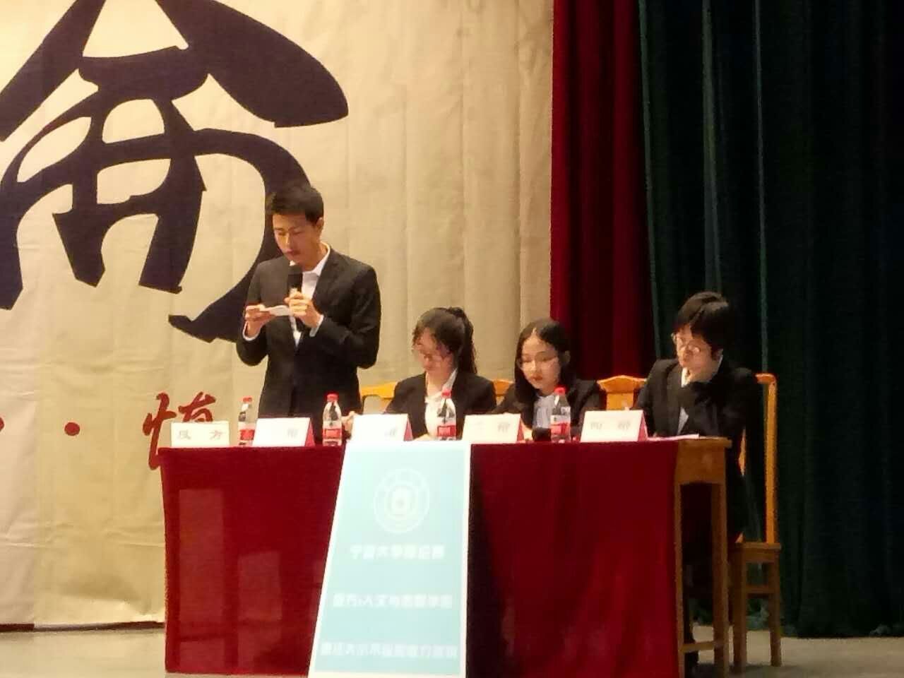 首先双方一辩做完立论陈词,对方四辩要立即质询,这十分考验辩手的归纳总结和临场反应的能力。海运一辩陈词结束,文院四辩反应灵敏,精准地攻击对方的论点;文院一辩立论“责任大小不应与能力挂钩,而与社会责任、个人意愿及后果承担挂钩”,陈词结束,海运四辩进行质询,其攻势虽猛,但文院一辩依旧巧妙化解了对方的质询,取得了最终胜利。