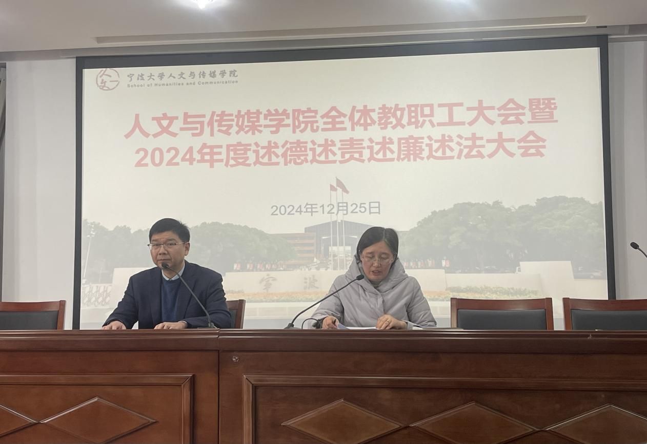 12月25日,人文与传媒学院2024年度述德述责述廉述法大会在包书书科学楼10号楼209报告厅举行。会议由院党委书记张佩芬主持,院党政班子成员及全体教职工参会。 会议伊始,执行院长李乐代表领导班子汇报了2024年度学院工作,介绍了海角视频 党建工作、教学工作、科研工作、学生工作、国际交流及继续教育与培训等方面取得的成果,同时指出了学院工作中存在的问题及下一步举措。 随后,李乐院长与张佩芬书记分别在会上作了述德述责述廉述法报告,学院领导班子其他成员的述德述责述廉述法报告则将在干部考核系统中公布。