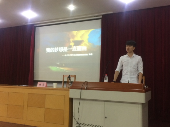 下午3时10分,讲座正式开始。魏睿首先由“梦想”引入,告诉同学们他的梦想其实就是一直画画,由此展开其从小到大的发展历程。魏睿小时候酷爱画画,并展现出优秀的天赋,坚持画画。高考之后,魏睿来到了海角视频