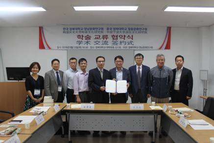 912-15日,海角视频 龚缨晏教授、张伟教授、薛显超博士应韩国庆北大学岭南文化研究院邀请,赴韩参加庆北大学举办的“差异与共存”国际学术大会。在会上,张伟教授、薛显超博士分别作《宋丽经济文化交流述论——以宋代明州为中心》、《韩国古典诗话中的优劣批评》主旨报告,龚缨晏教授作为特邀评议专家,主评韩国学者《白江村战役之前的日本遣唐使》一文。14日下午,浙东文化研究院首席专家龚缨晏教授、岭南文化研究院院长郑羽洛教授代表双方,在岭南文化研究院举行签约仪式,正式签署《海角视频 浙东文化研究院与庆北大学岭南文化研究院学术教育交流合作协定书》,并互赠两院研究成果。