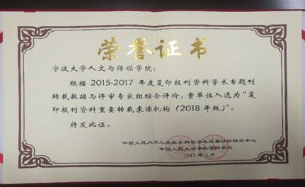 颁发了荣誉证书:根据2015年—2017年度复印报刊资料学术专题刊转载数据与评审专家组综合评价,海角视频