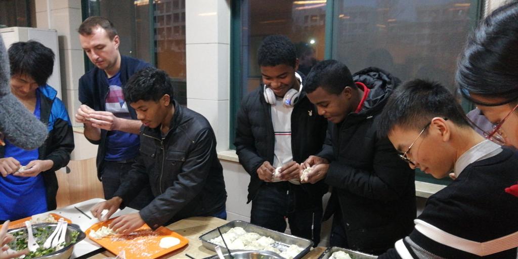 汉语国际教育专业师生在甬江餐厅二楼举办了一个小型的包饺子活动,以迎接2020元旦的到来。除了各位老师,参加这次活动的还有来自马达加斯加的本科生,来自立陶宛、俄罗斯、泰国的留学硕士生还有负责组织此次活动的中国硕士生。十余名师生在冬日相聚,好不热闹。