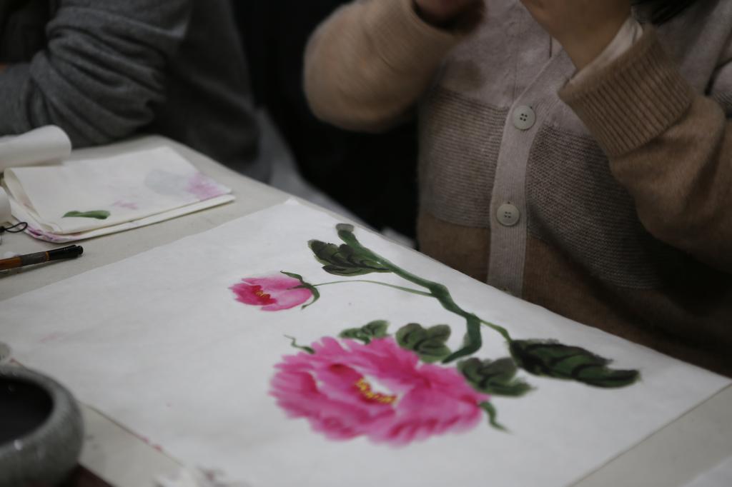 插花活动结束后,老师又教大家进行艺术扇面创作活动,针对用笔方式、如何配色、勾线技巧进行手把手教学,女教工们用毛笔和颜料,自行在团扇、折扇和宣纸上画出了一幅幅色彩明朗的花草绘画,把对美好生活的向往和追求敬请挥洒。