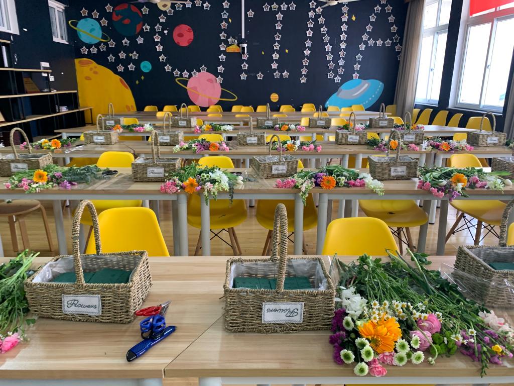 女教工们首先培训老师的指导下,从花材选取、色彩搭配、结构设计等方面体验了插花活动。大家用灵巧的双手将原本普通的花材经过修剪、整枝、排列,根据不同花的形状、颜色搭配在一起,现场创作出属于自己的插花作品。一盆盆形态各系、鲜活灵动的花艺摆件在老师们手中悄然绽放。