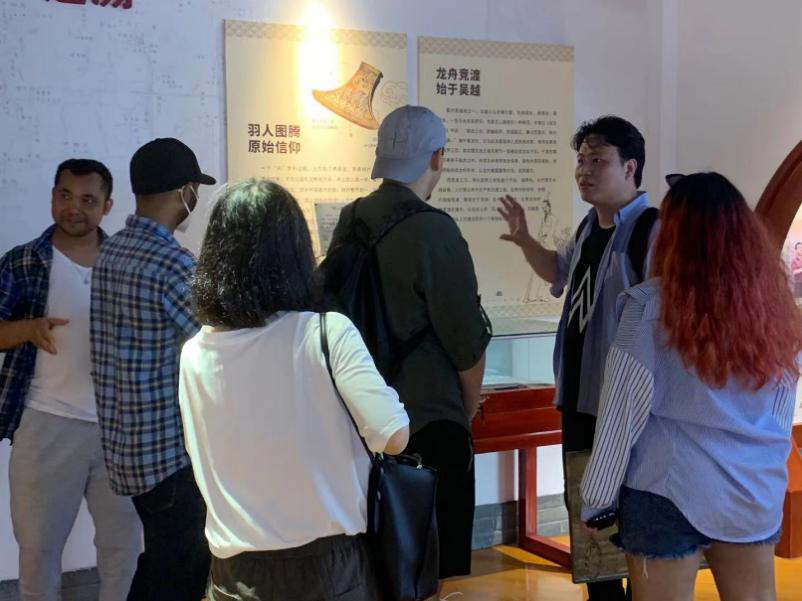 赛后,同学们参观了云龙镇龙舟训练基地与龙舟文化博物馆。由云龙镇陈玲玲老师讲解,同学们首先深入了解了龙舟运动员的日常训练与生活情况,龙舟运动的器械、赛制、比赛场所与组织等知识,进而在龙舟博物馆中对云龙镇龙舟文化进行了进一步的参观学习。云龙镇的龙舟文化源远流长,著名的战国文物“羽人竞渡”纹铜钺就出土于云龙镇甲村石秃头山出土,距今已有两千多年。从2008年开始,经过13年的发展,龙舟竞渡在云龙镇已从一种单纯的地方民俗,发展成为众多年轻群体喜爱的竞技性运动,近年来更发展出“陆地龙舟”等多种群众体育参与方式。2014年,云龙镇被中国民协授予“中国龙舟文化之乡”称号。
