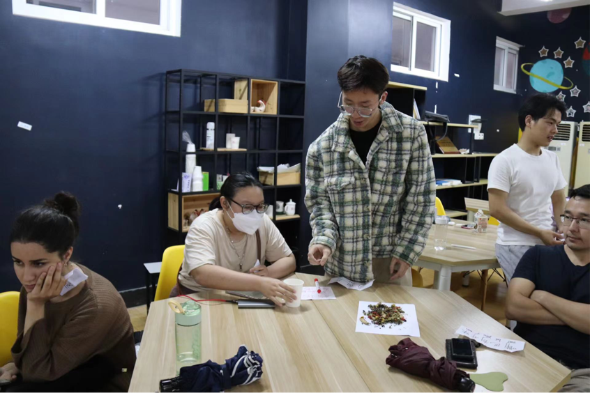 讲座伊始,毛老师向在场的留学生们介绍了中医文化的由来、发展历史和中医的诊疗法,并拿出特意带来的刮痧板、玻璃罐和艾灸贴,通过生动的讲解和操作示范将中医的几种诊疗法和养生之道分享给在场的留学生。紧接着汉硕同学齐上阵,将准备好的药材分发给每个小组,并向留学生介绍每种药材的名字,功效及组合搭配。菊花、枸杞、决明子、金银花……清热、降火、消炎、解毒……现场讨论热烈,汉硕同学与留学生积极互动,博大精深的中医文化在真实可感的体验实践中,走进了每个留学生的心中。