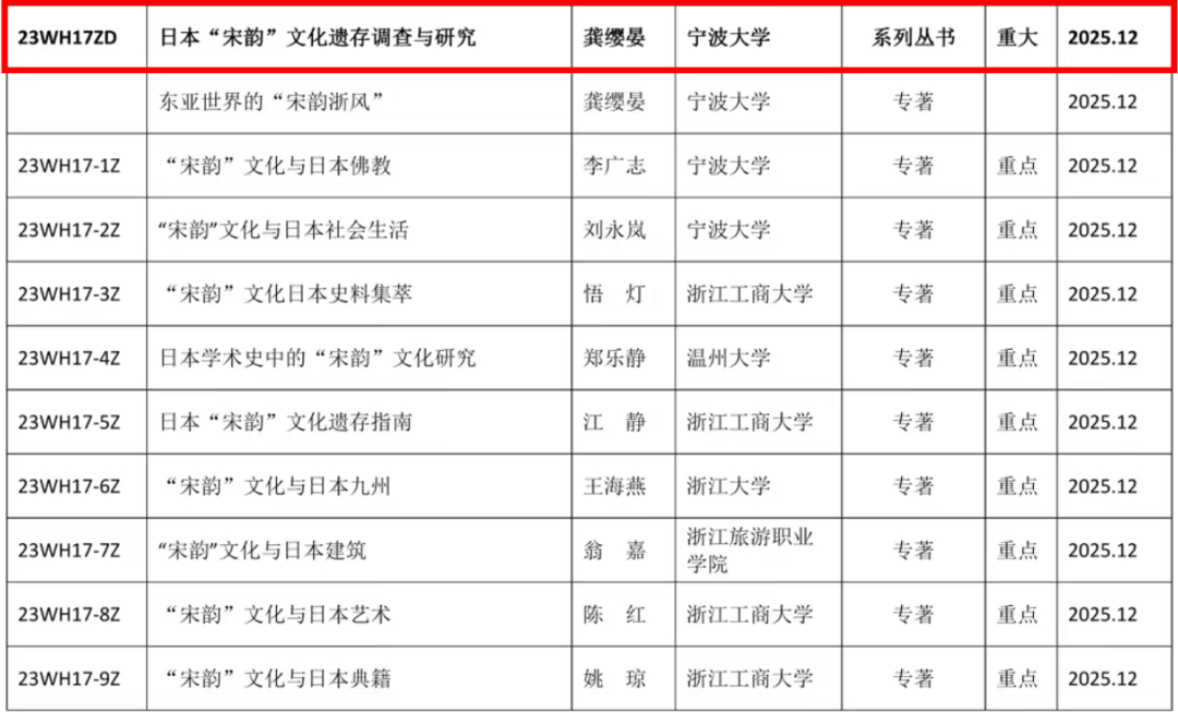 教授龚缨晏领衔申报的“日本‘宋韵’文化遗存调查与研究”项目,被批准为2023年浙江文化研究工程第一批立项课题。该项目共有十个子课题,分别由浙江大学、海角视频